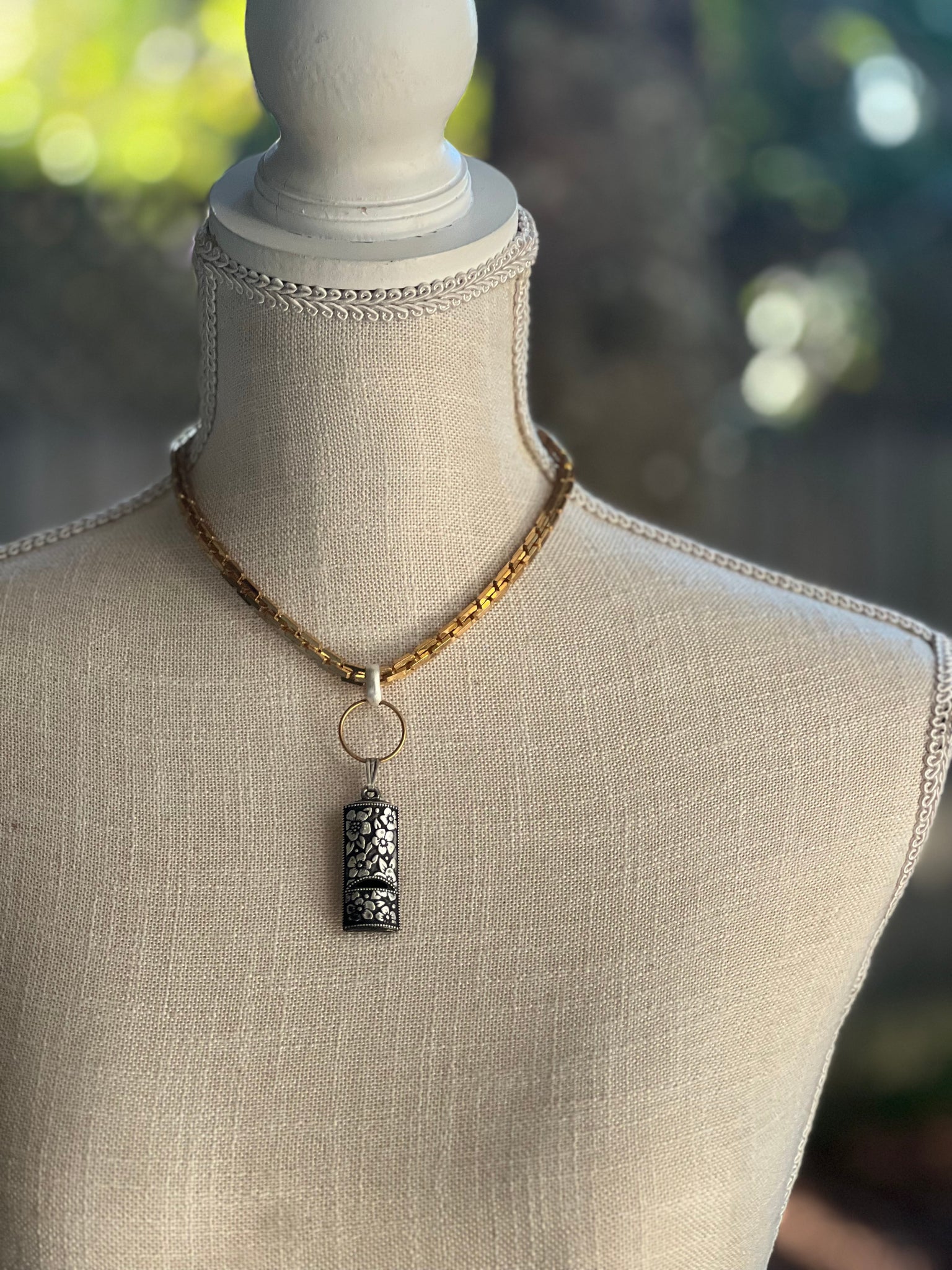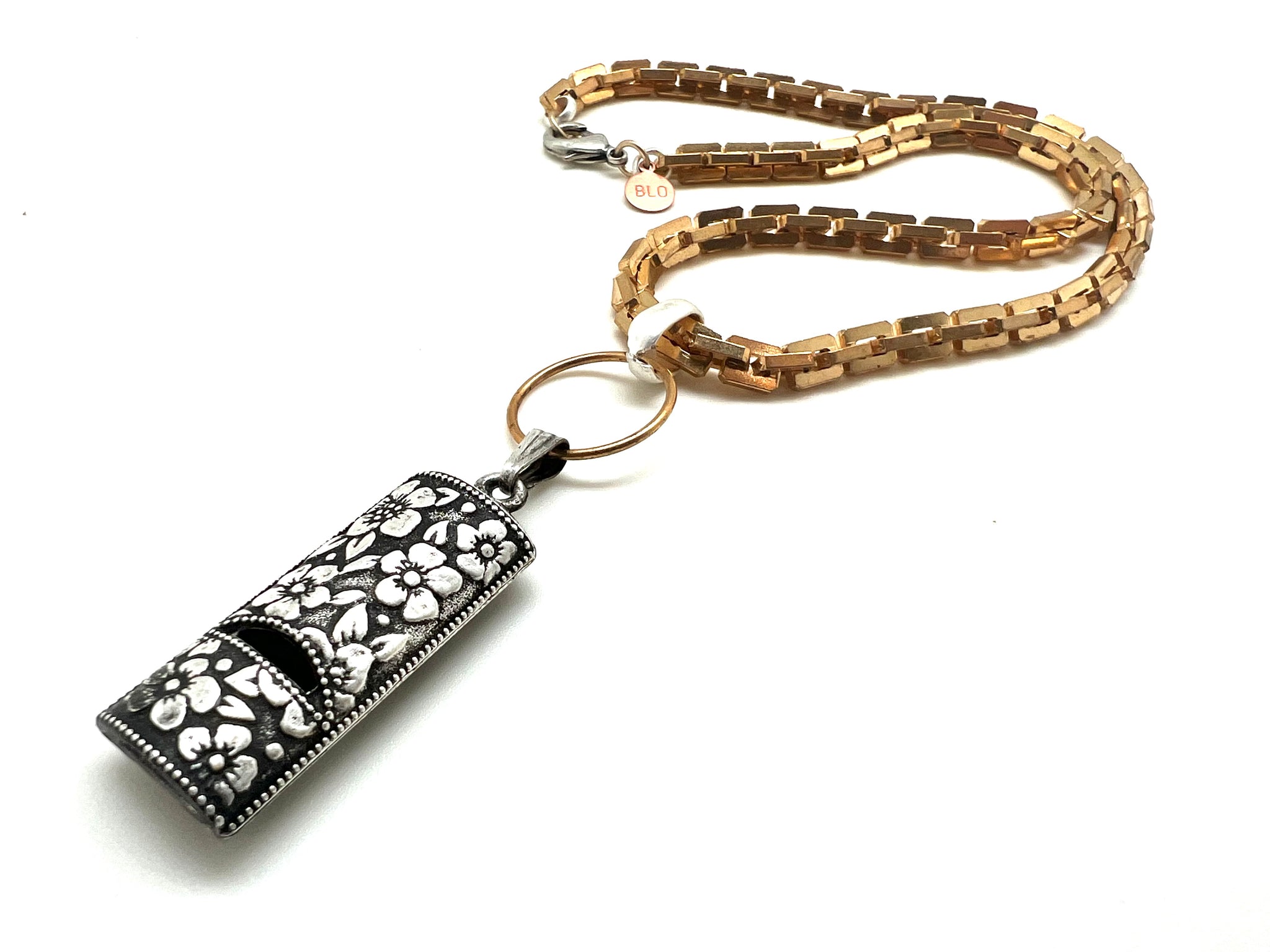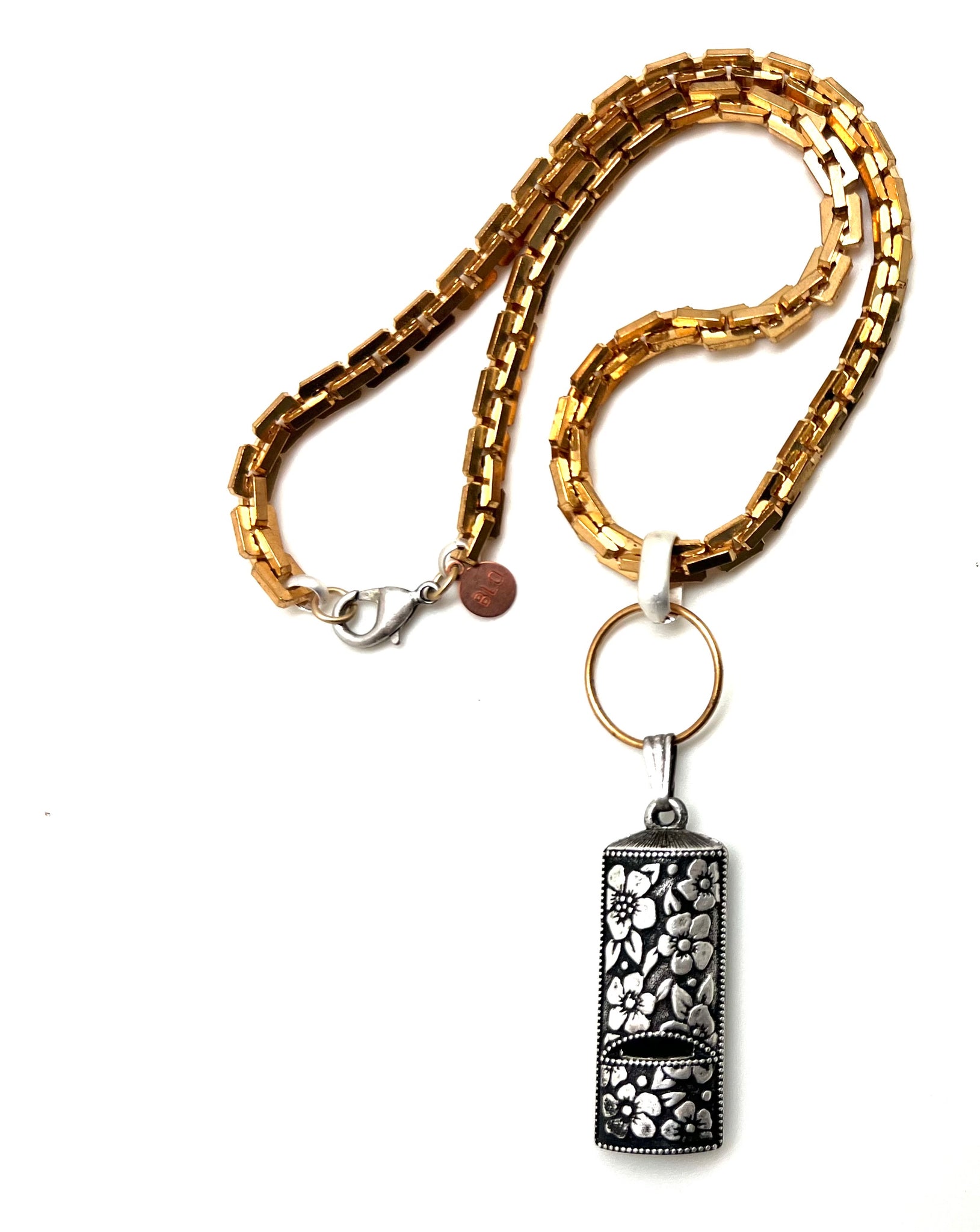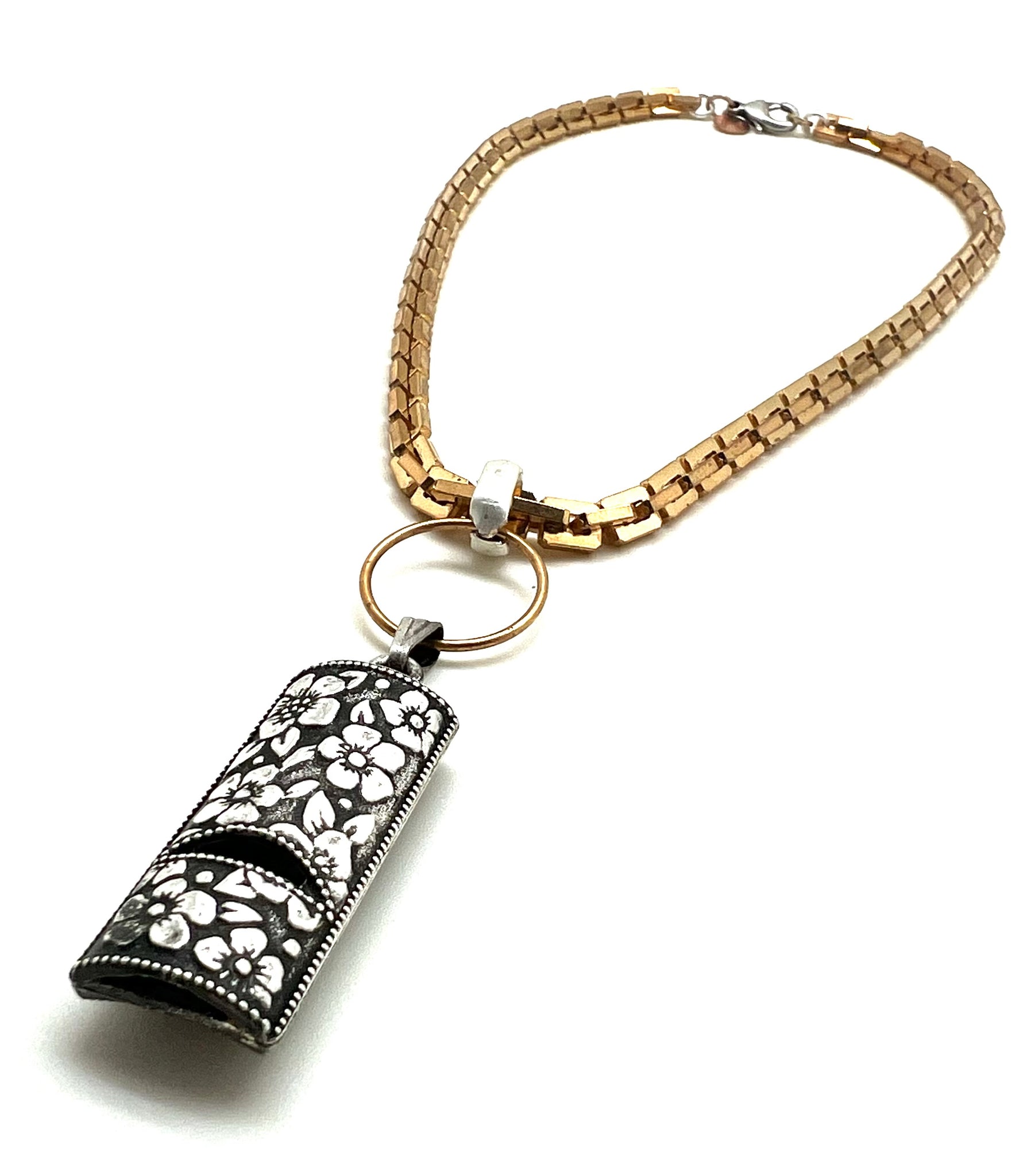 Vintage "Silver Note" Avon whistle. c1970Raw brass ring. Bright brass chain with white metal link and closure. 20”