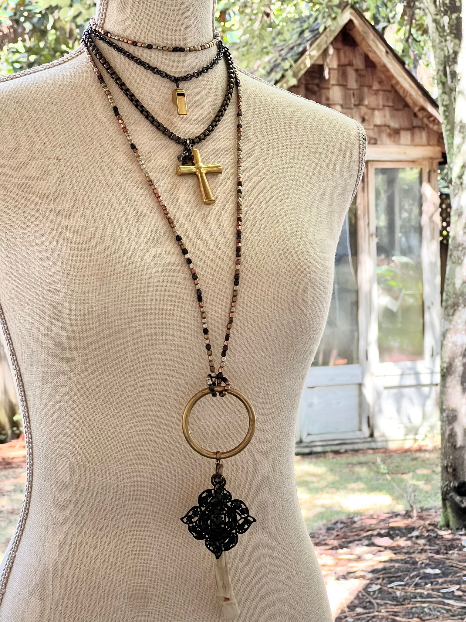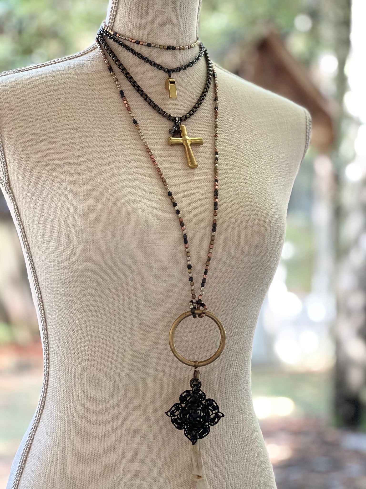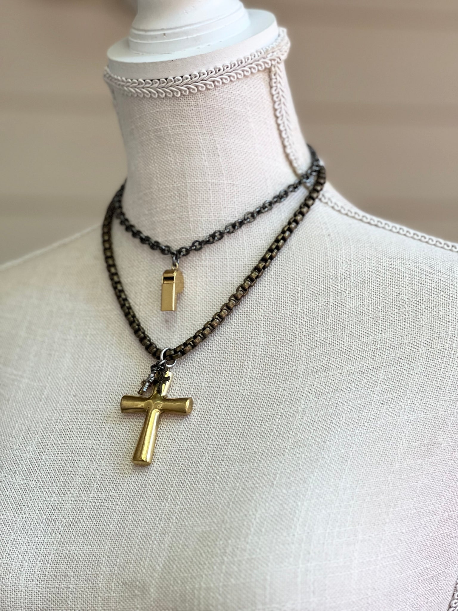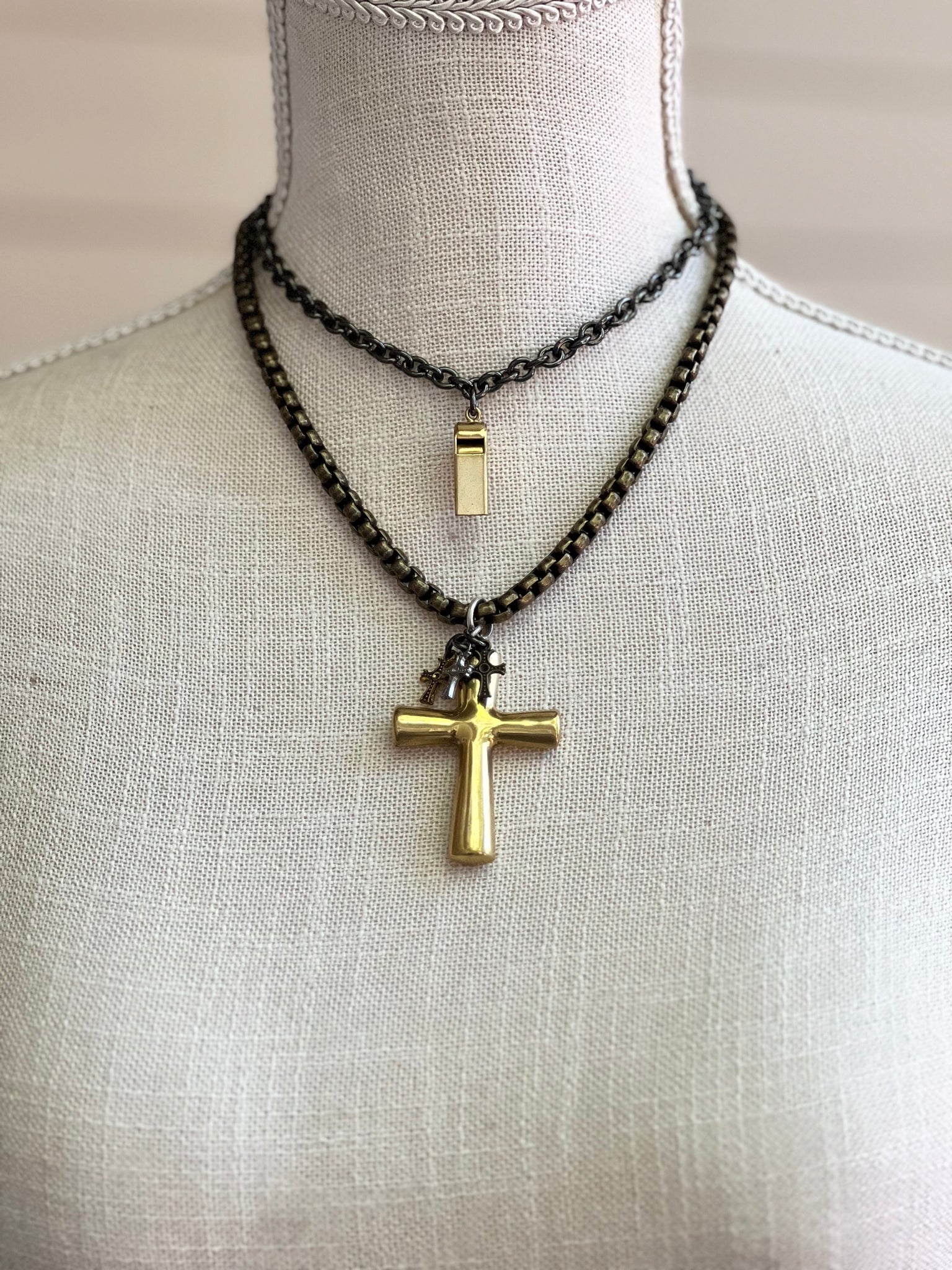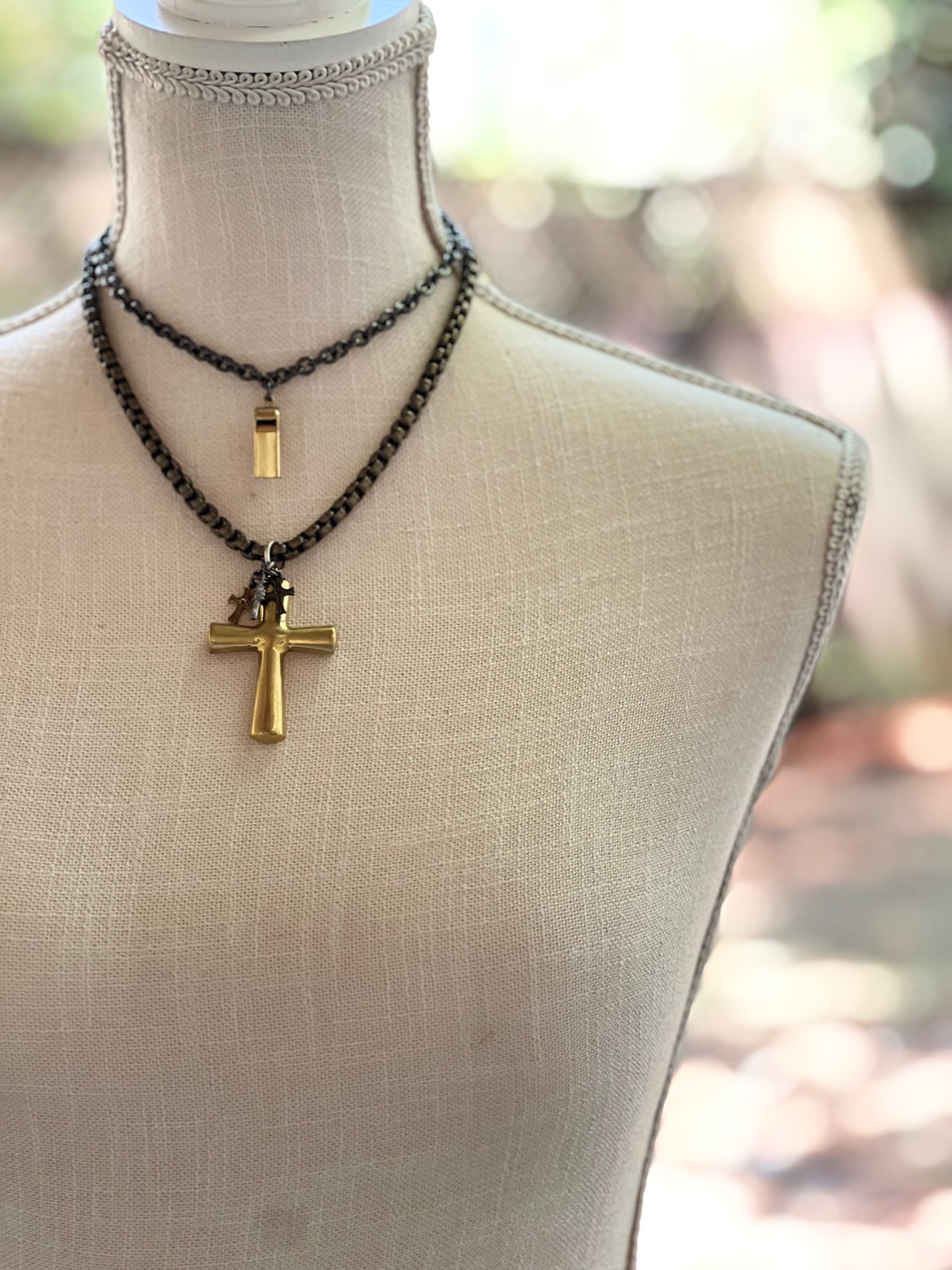 Brass puffy heart coupled with brass mini heart charms.