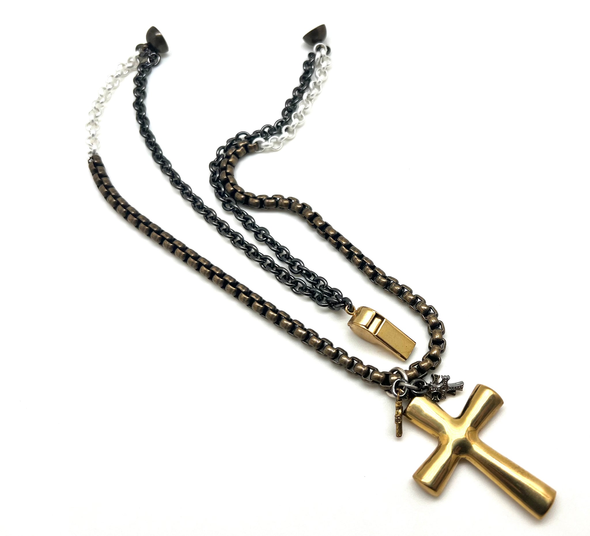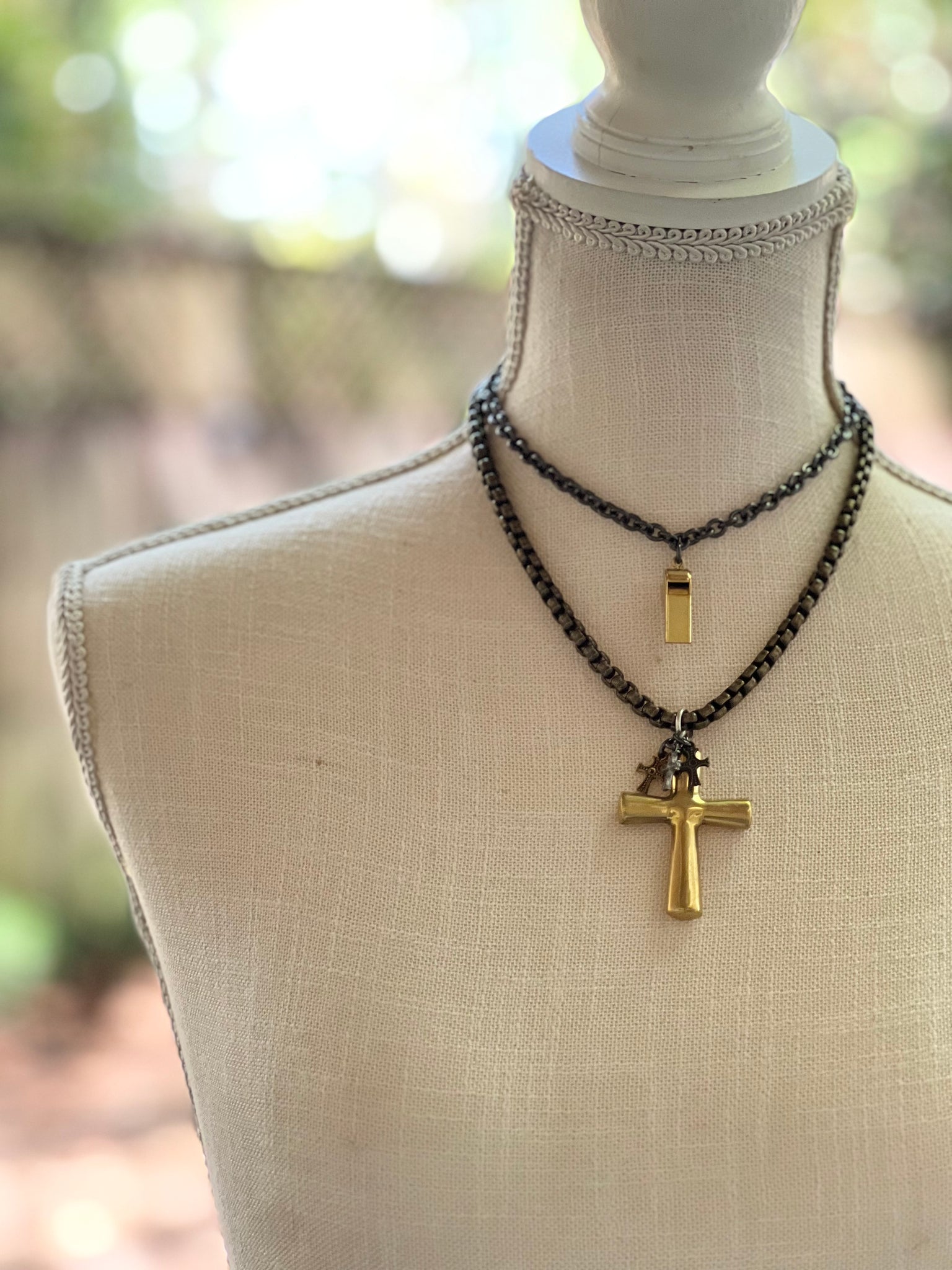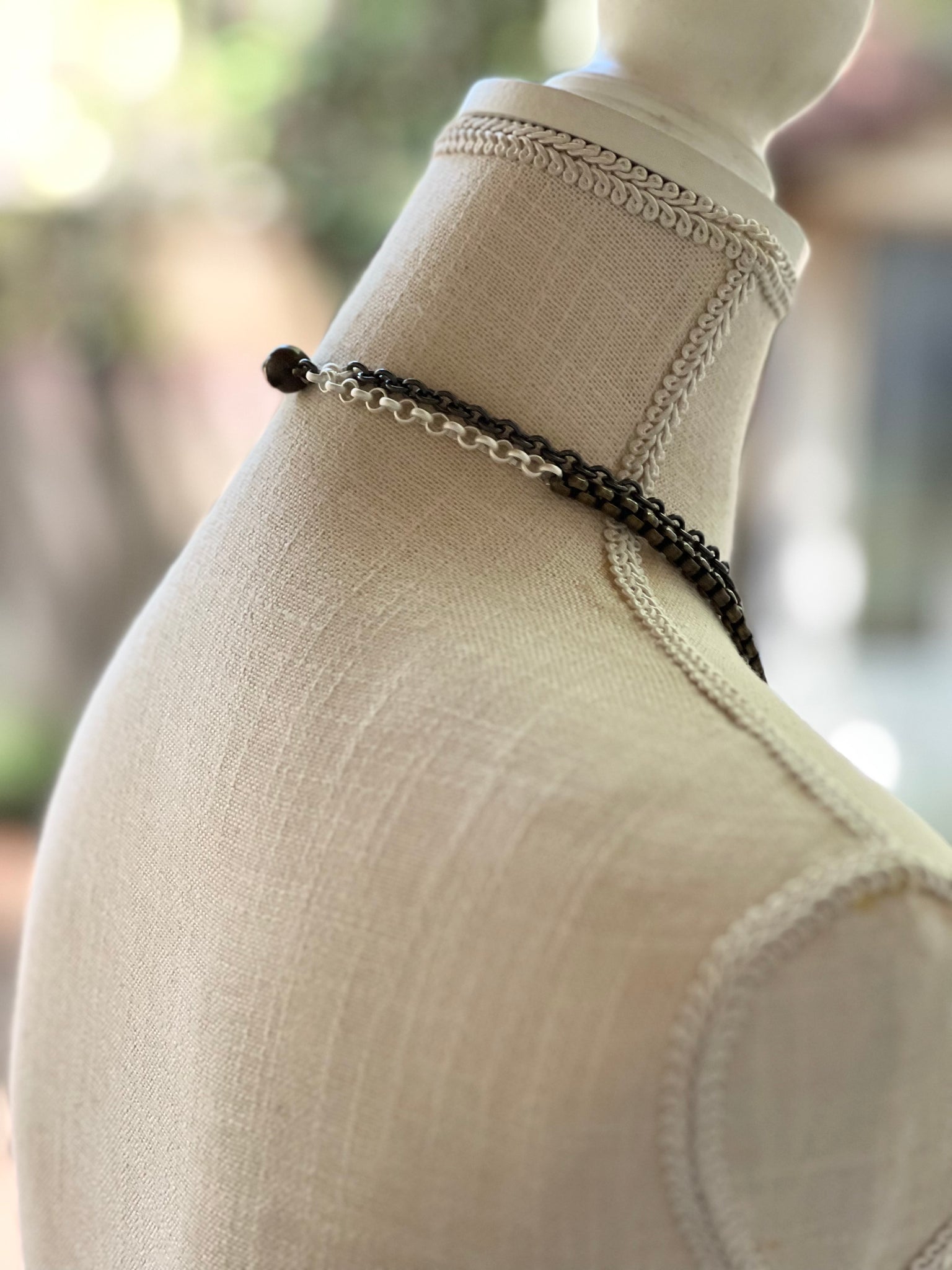 Shiny gun metal double strand chain.