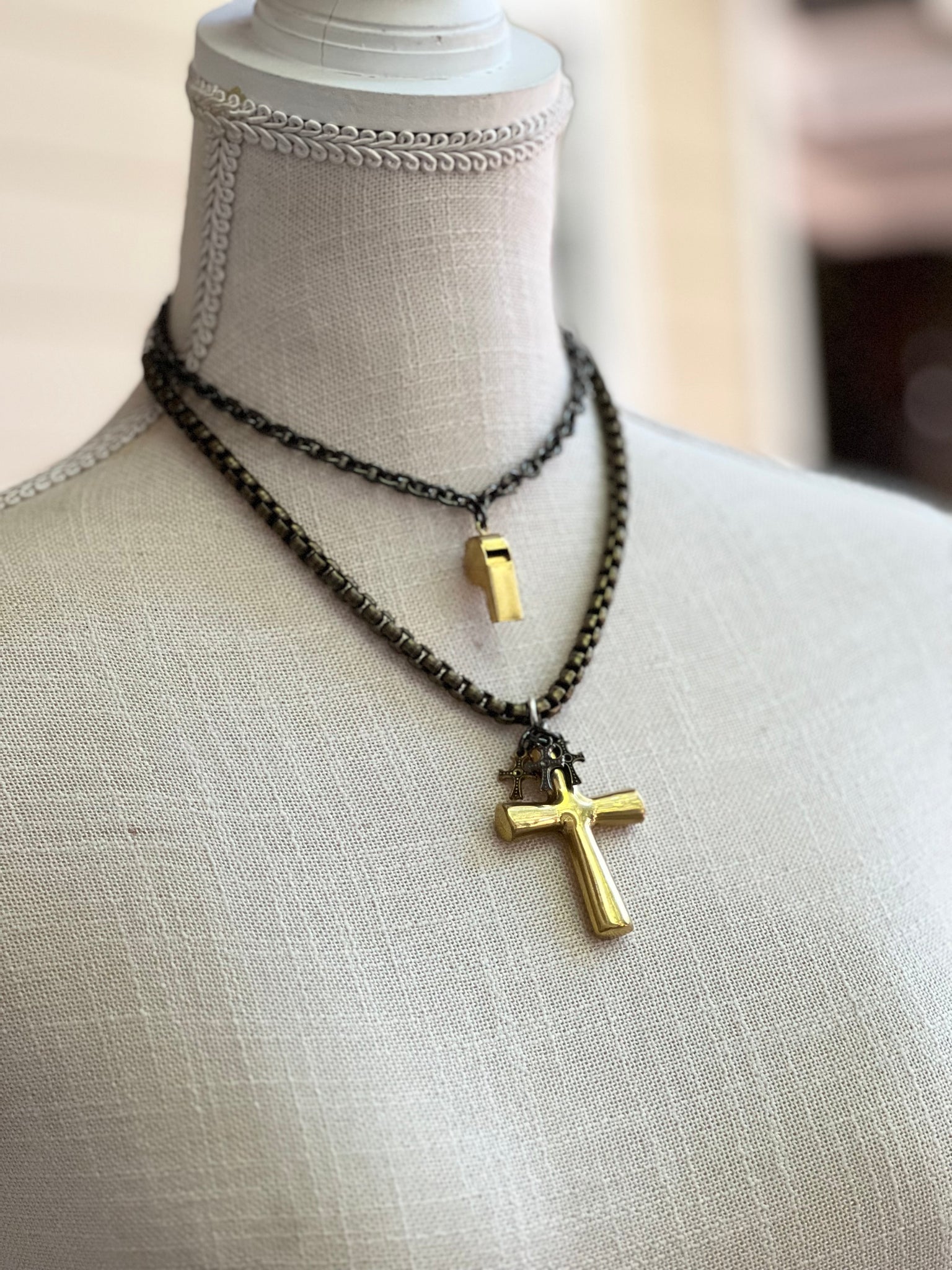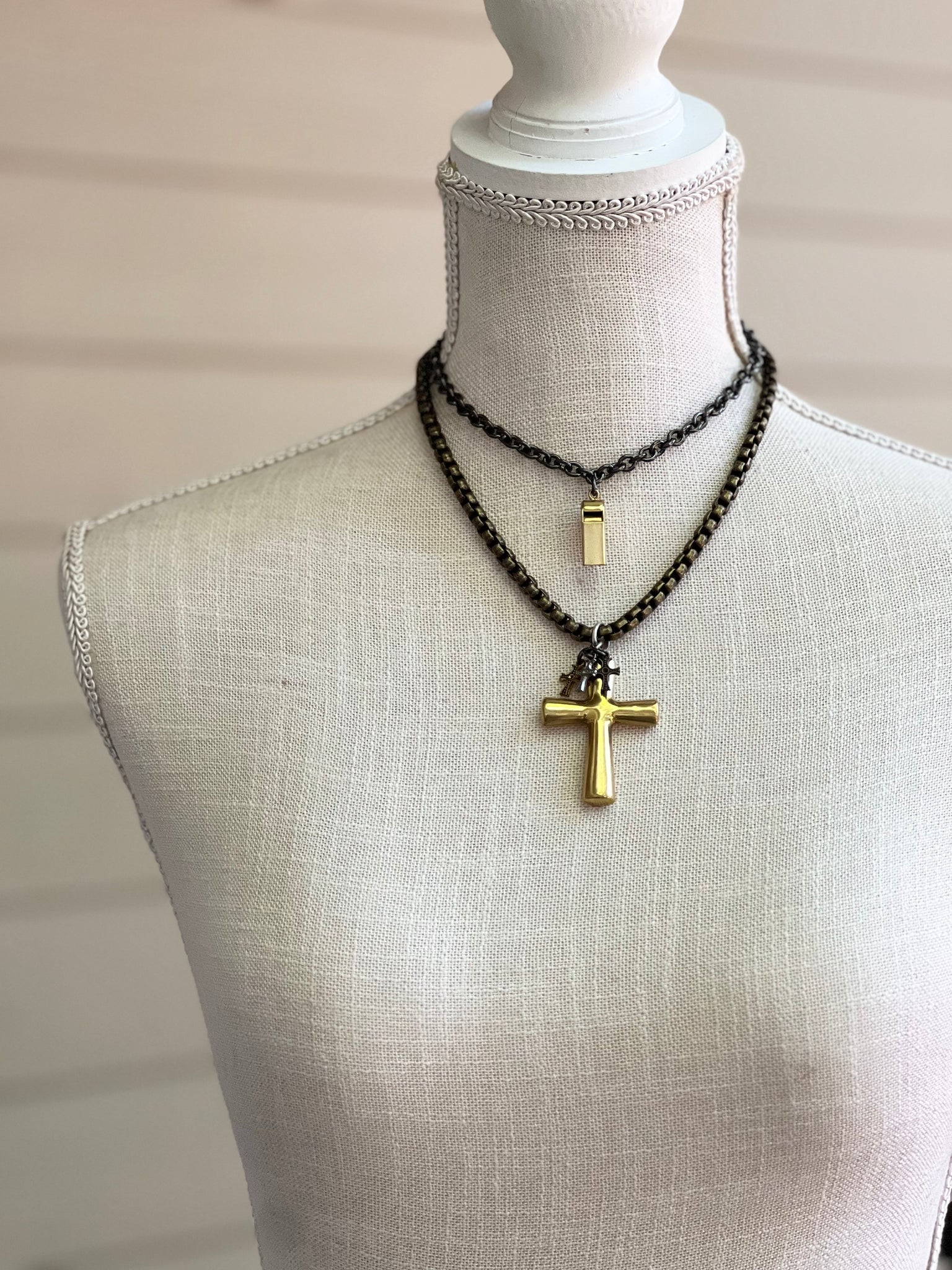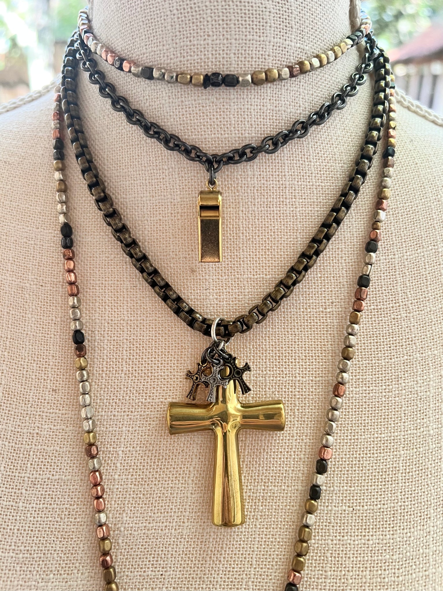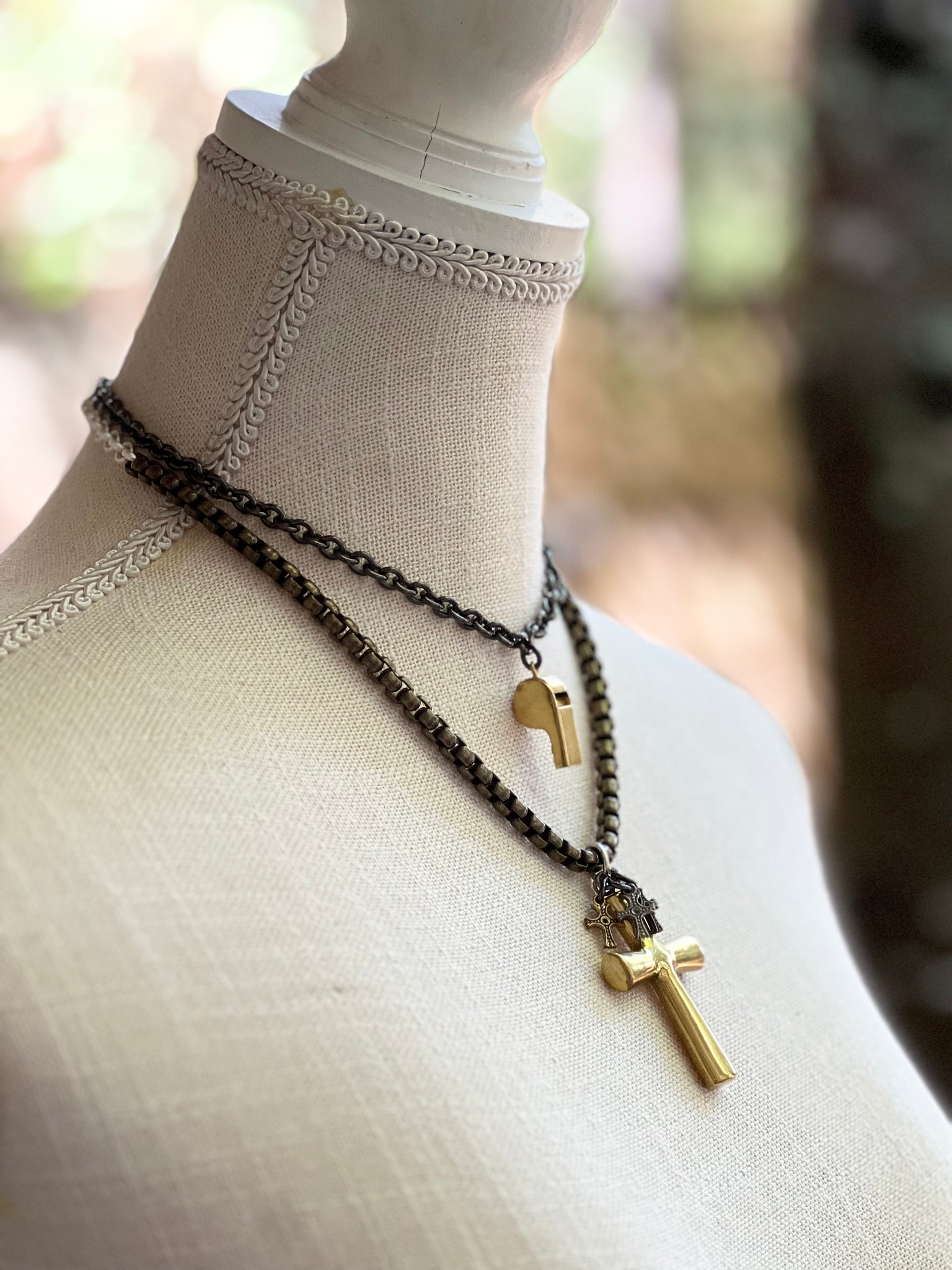 Shiny gun metal double strand chain.